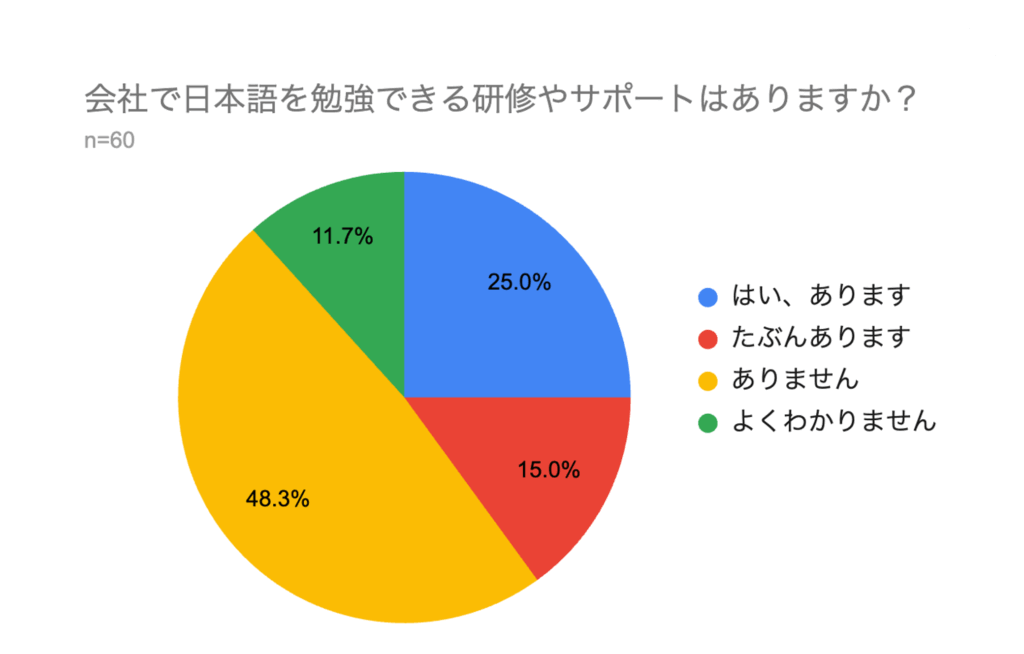 日本語研修の利用意向は88%と高いものの、実際に研修やサポートがあると答えたのは25%にとどまり、需要と供給のギャップが浮き彫りになっている。