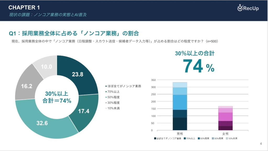 調査の結果、採用担当者の約74%が日程調整やデータ入力などのノンコア業務に業務時間の30%以上を費やしていることが判明した。一方、AIツールを導入した担当者の95%が工数削減を実感しており、削減幅は「30%程度」が最多(53.47%)で、週40時間勤務換算で週約12時間・月48時間の工数削減に相当する。