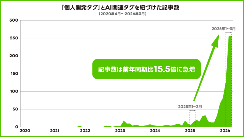 特に注目されるのが「個人開発×AI」の急増だ。「個人開発」タグとAI関連タグの両方を紐づけた記事数は、2024年の73件から2025年には271件(3.7倍)へ拡大。さらに2026年1〜3月だけで465件に達し、2025年の年間投稿数を早くも超えた。2025年1〜3月の30件と比較すると、前年同期比で約15.5倍という驚異的な伸びを記録している。