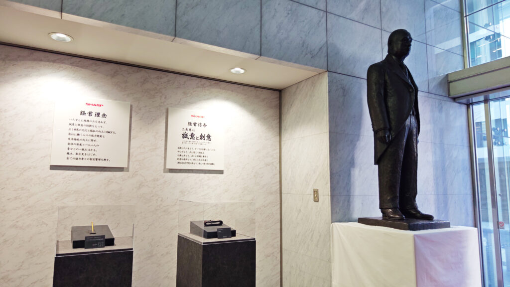 新本社の1階エントランスには、創業者 早川徳次の銅像とともに、シャープの礎を築いた「徳尾錠」「早川式繰出鉛筆」が展示されている。「早川式繰出鉛筆」の改良版として販売された「エバー・レディ・シャープ・ペンシル」は、現在広く使われる「シャープペンシル」という名称の由来であり、社名「シャープ」もここから来ている。