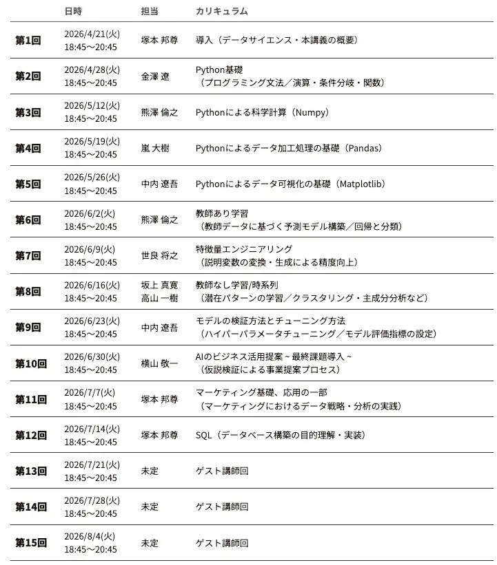 カリキュラムはPythonプログラミングの基礎に始まり、データ加工・可視化、教師あり学習・教師なし学習などの機械学習手法、SQLによるデータベース操作、AIのビジネス活用提案までを網羅。Kaggle形式のデータ分析コンペティションや最終課題演習を通じ、実務レベルの力を養う設計となっている。オンライン(Zoom)開講で全国から受講可能なほか、アーカイブ動画にも対応する。