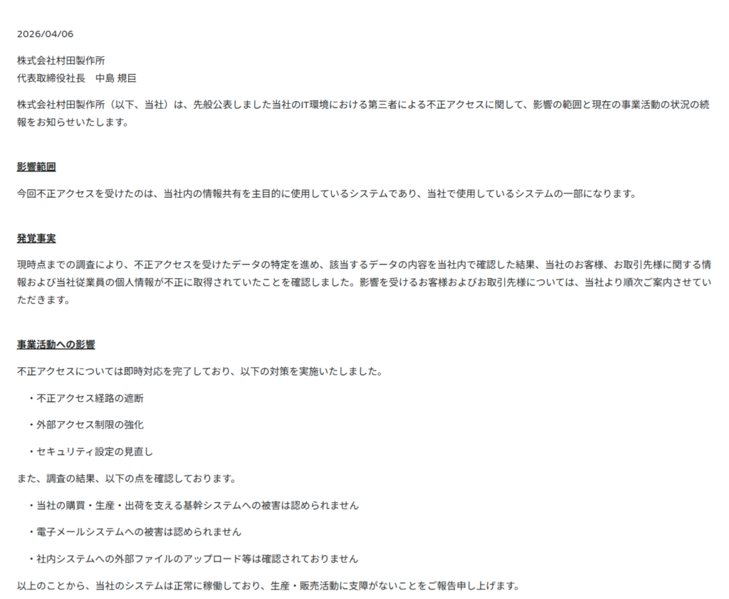 不正アクセスを受けたのは社内の情報共有を主目的に使用するシステムで、同社は2026年2月28日にその可能性を認識し、3月1日から本格的な調査を開始した。今回の4月6日発表は第2報にあたり、流出した情報の具体的な件数や詳細内容については現在も調査中としている。