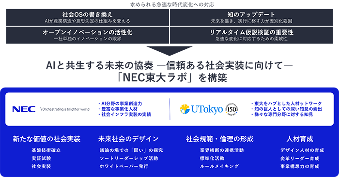 東京大学と日本電気株式会社(NEC)は2026年3月17日、「AIと共生する未来の協奏——信頼ある社会実装に向けて」をビジョンに掲げ、人とAIが豊かに共生する信頼社会の実現を目的とした産学協創協定を締結した。協定の締結と同時に、共同活動の実行母体となる「NEC東大ラボ」を設置する。