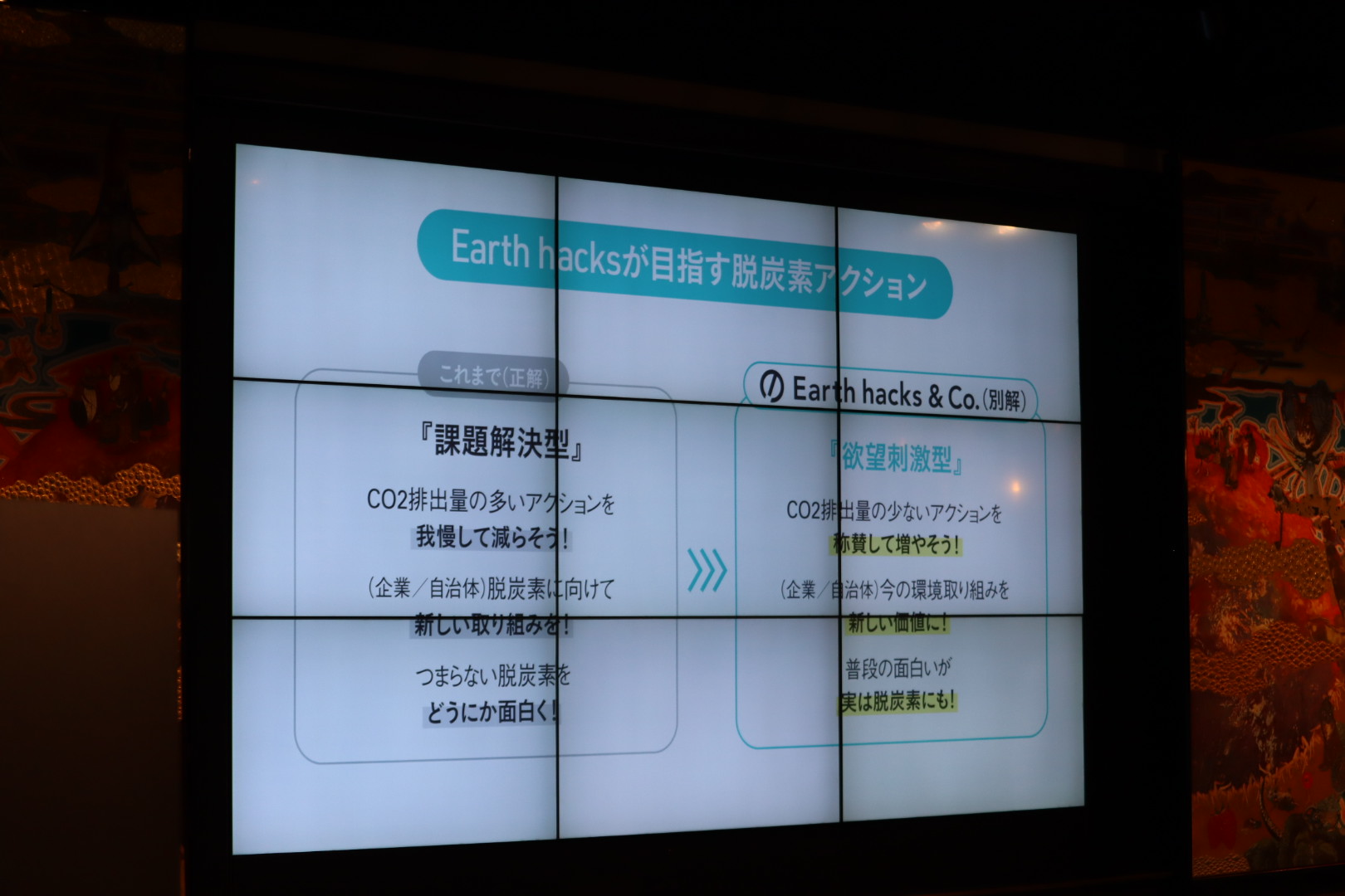 Earth hacks株式会社は、生活者一人ひとりの行動を起点に、脱炭素社会の実現を目指す共創型プラットフォームを展開する企業。